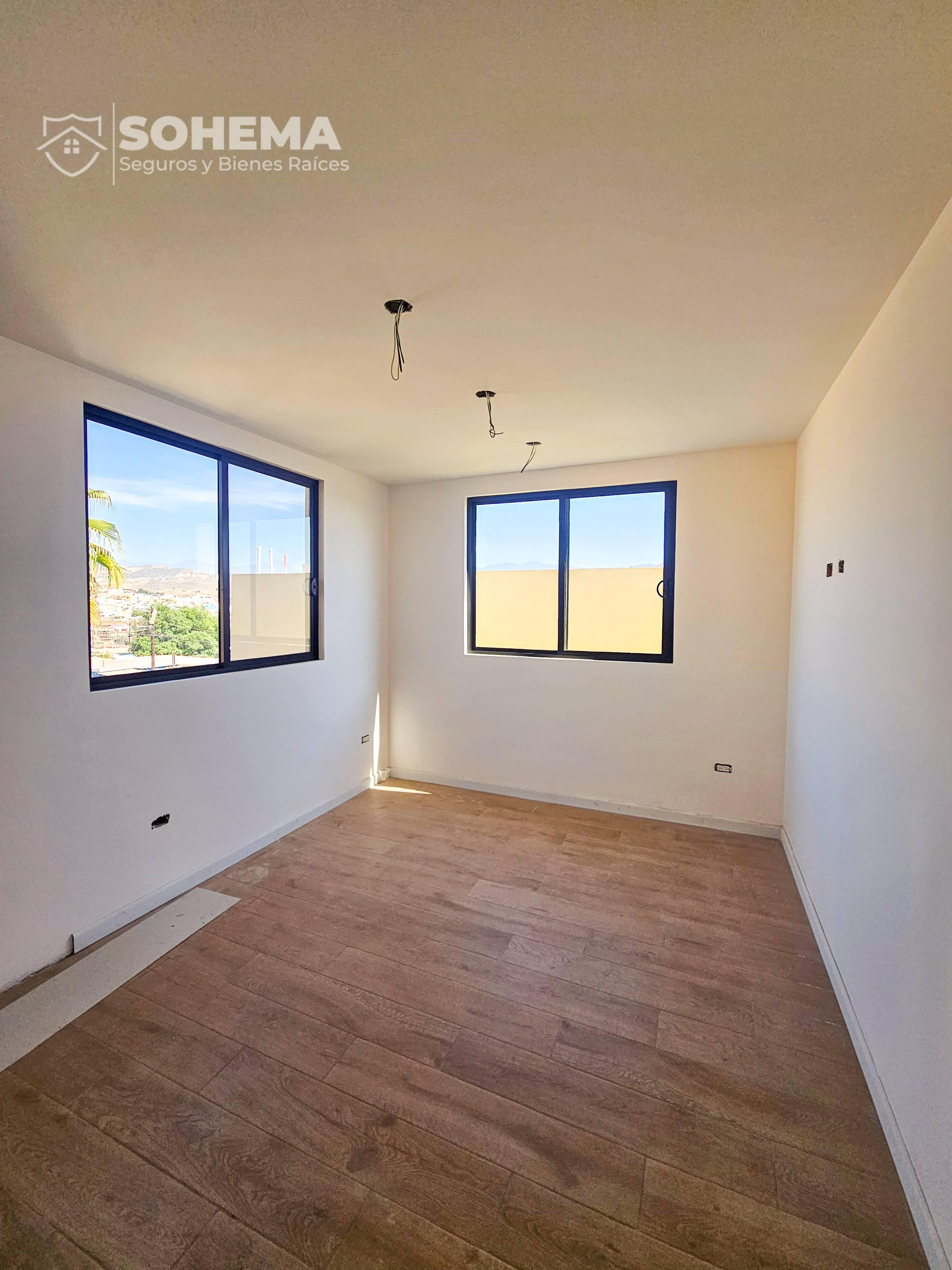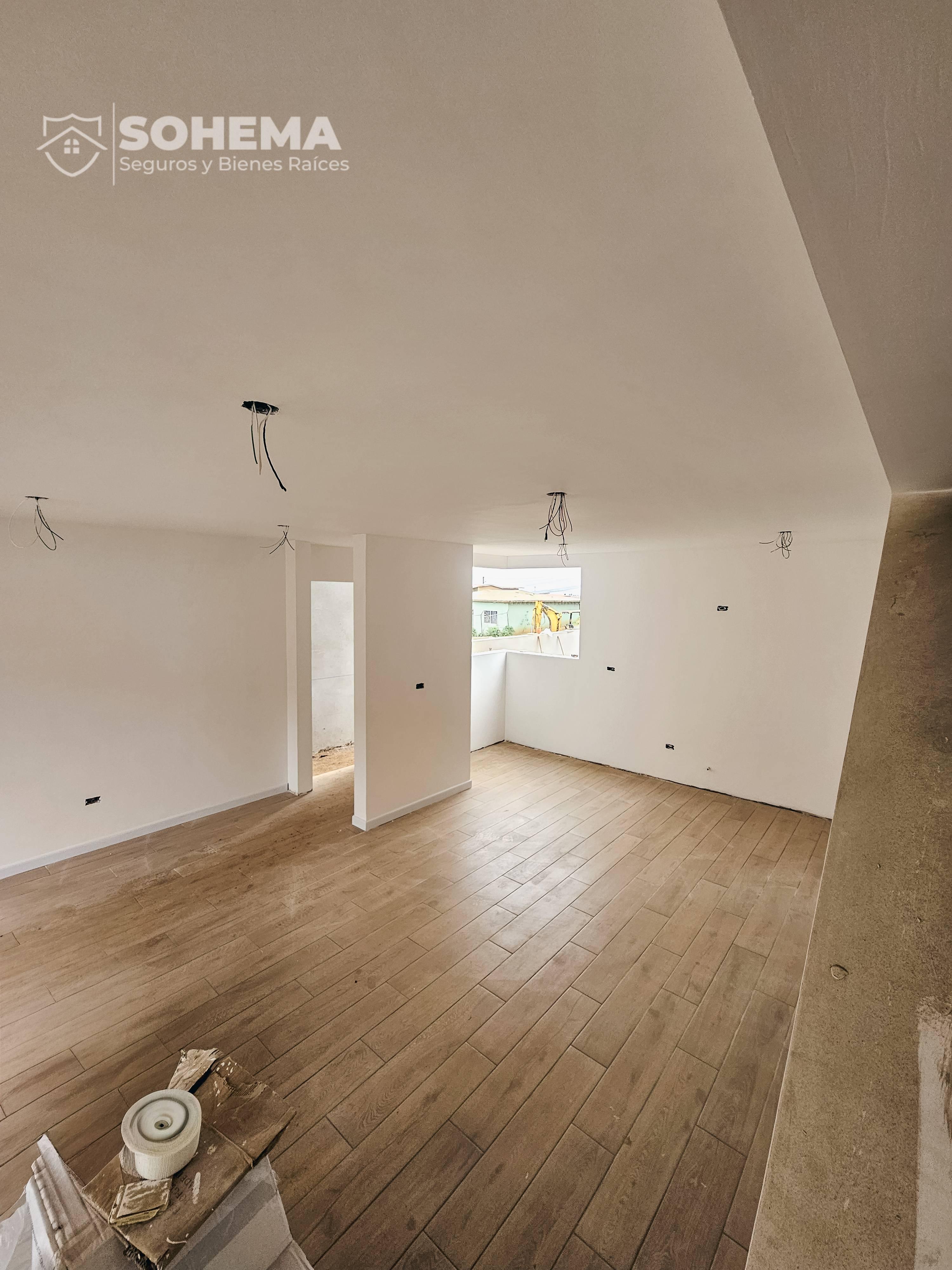 Pisos de loseta o laminado, baños equipados, ventanas y puertas de aluminio, y puerta principal de madera sólida.
