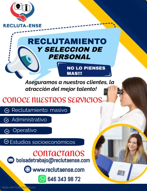 RequisitosEn RECLUTA- ENSE, somos profesionistas comprometidos en ofrecer servicios de reclutamiento y selección de personal, contamos con experiencia en área operativa , administrativa y masiva, en diferentes giros de empresas (Maquiladora, mercados, restaurante, vinícolas, pesqueras, seguridad, agrícola, financiera, etc.). Nuestros clientes siempre serán lo mas importante… Otros servicios: *Realización e interpretación de exámenes psicométricos. *Estudios socioeconómicos. Aseguramos a nuestros clientes la atracción del mejor talento!!! Cotizaciones: bolsadetrabajo@reclutaense.com / WhatsApp: 646 343 98 72, (Contamos con oficina en Zona centro, para realizar entrevistas presenciales), manejamos precios accesibles dependiendo el tamaño y giro de la empresa, nuestro equipo tiene mas de 15 años de experiencia en recursos humanos. Contáctanos: resultados comprobables, con clientes satisfechos! (("NOTA: ESTE ANUNCIO NO ES PARA OFRECER EMPLEO, VA DIRIGIDO A EMPRESAS QUE QUIEREN CONTRATAR EL SERVICIO DE RECLUTAMIENTO Y SELECCION DE PERSONAL"))