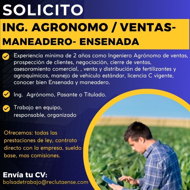 RequisitosSOLICITO INGENIERO AGRONOMO PARA VENTAS: *Ingeniero Agrónomo, Pasante o Titulado, ("NO ESTUDIANTES") *Hombre de 27 a 40 años. *Que radique en la ciudad de Ensenada, Baja California. *Recién egresado, con ganas de aprender y superarse. *Experiencia mínima 1 año, de preferencia en fertilizantes, agroquímicos, semillas. *Licencia C vigente. Manejo de vehiculo estandar. *Conocer bien Ensenada, Maneadero. *Disponibilidad de viajar esporádicamente. *Prospección y visita a clientes. *Cierre de ventas. *Negociación. *Asesoría técnica y comercial. *Ofrecemos: todas las prestaciones de ley, contrato directo por la empresa, sueldo base, comisiones por ventas, vehículo utilitario (gasolina y mantenimiento de la unidad, son pagados por la empresa), 30 días de aguinaldo, uniformes, utilidades, empleo estable, opción de contrato de planta. Horario: de Lunes a Viernes de 8 am a 5 pm y Sábados de 8 am a 1 pm. *Frecuencia de pago: quincenal. Si cubres con el perfil, comparte tu curriculum actualizado, con fotografía: bolsadetrabajo@reclutaense.com