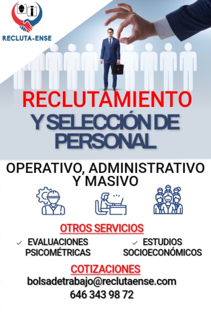 RequisitosEn RECLUTAENSE S.C., somos profesionistas comprometidos en ofrecer servicios de reclutamiento y selección de personal en Ensenada, Tijuana, Mexicali, San Quintín, contamos con experiencia en área operativa , administrativa y masiva, en diferentes giros de empresas (Maquiladora, mercados, restaurante, vinícolas, pesqueras, seguridad, agrícola, financiera, etc.). Nuestros clientes siempre serán lo mas importante… Otros servicios: *Realización e interpretación de exámenes psicométricos. *Estudios socioeconómicos. Aseguramos a nuestros clientes la atracción del mejor talento!!! Cotizaciones: 646 343 98 72 / bolsadetrabajo@reclutaense.com, (Contamos con oficina en Zona centro, para realizar entrevistas presenciales), manejamos precios accesibles dependiendo el tamaño y giro de la empresa, nuestro equipo tiene mas de 15 años de experiencia en recursos humanos. Contáctanos: resultados comprobables, con clientes satisfechos! (("NOTA: ESTE ANUNCIO NO ES PARA OFRECER EMPLEO, VA DIRIGIDO A EMPRESAS QUE QUIEREN CONTRATAR EL SERVICIO DE RECLUTAMIENTO Y SELECCION DE PERSONAL"))