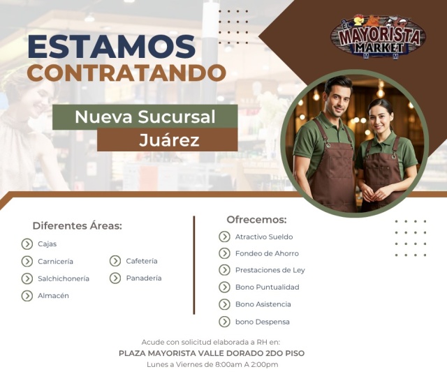 RequisitosAcude este martes 28 de Octubre, a las oficinas de Recursos Humanos en Plaza Mayorista Valle Dorado con tu solicitud elaborada. Se realizara reclutamiento masivo de 8:00 am a 4:30 pm. Ven y forma parte de nuestro equipo de trabajo