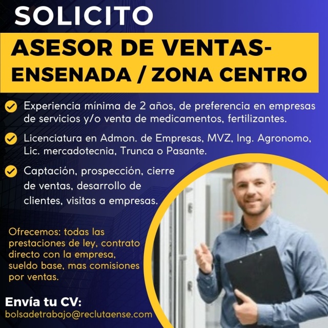 RequisitosSOLICITO ASESOR DE VENTAS, EN ZONA CENTRO: *MVZ, Lic. Administración de Empresas, Lic. Negocios, Lic. Relaciones Comerciales, Lic. en Mercadotecnia y/o Carrera afín, trunco o pasante. *Experiencia mínima de 2 años en ventas de preferencia en empresas de servicios, venta de medicamentos, veterinarios y/o ganas de aprender y capacitarse del tema. *Conocer bien Ensenada. *Manejo de vehículo estándar. *Licencia vigente. *Facilidad de palabra. *Persuasión. *Buena presentación. *Atención y servicio al cliente. *Asesoría comercial y técnica. *Negociación. *Comunicación efectiva. *Trabajo en equipo. *Cumplimiento del presupuesto de ventas asignado. *Búsqueda y prospección de clientes. *Ofrecemos: todas las prestaciones de ley, sueldo base + comisiones del producto vendido, capacitación, contrato directo con la empresa, vehículo utilitario (gasolina y mantenimiento de la unidad, son pagadas por la empresa), trabajo estable, opción de contrato de planta. *Horario: de Lunes a Viernes de 8 am a 5 pm y Sábados de 8 am a 1 pm. Si cubres con el perfil, envía tu curriculum actualizado con fotografía: bolsadetrabajo@reclutaense.com
