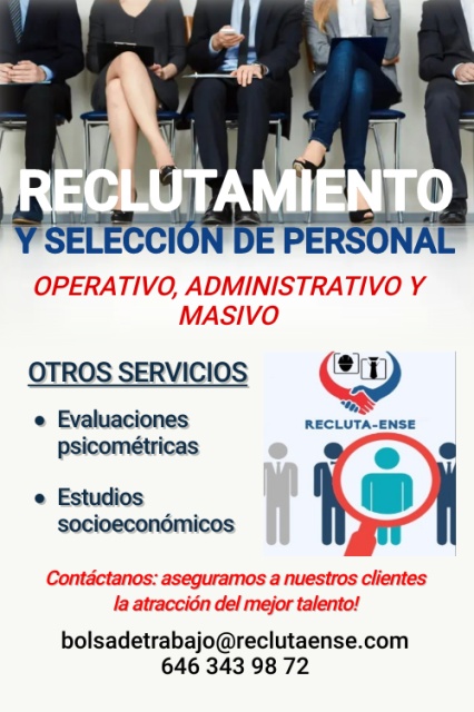 RequisitosEn RECLUTAENSE S.C., somos profesionistas comprometidos en ofrecer servicios de reclutamiento y selección de personal en Ensenada, Tijuana, Mexicali, San Quintín, contamos con experiencia en área operativa , administrativa y masiva, en diferentes giros de empresas (Maquiladora, mercados, restaurante, vinícolas, pesqueras, seguridad, agrícola, financiera, etc.). Nuestros clientes siempre serán lo mas importante… Otros servicios: *Realización e interpretación de exámenes psicométricos. *Estudios socioeconómicos. Aseguramos a nuestros clientes la atracción del mejor talento!!! Cotizaciones: 646 343 98 72 / bolsadetrabajo@reclutaense.com, (Contamos con oficina en Zona centro, para realizar entrevistas presenciales), manejamos precios accesibles dependiendo el tamaño y giro de la empresa, nuestro equipo tiene mas de 15 años de experiencia en recursos humanos. Contáctanos: resultados comprobables, con clientes satisfechos! (("NOTA: ESTE ANUNCIO NO ES PARA OFRECER EMPLEO, VA DIRIGIDO A EMPRESAS QUE QUIEREN CONTRATAR EL SERVICIO DE RECLUTAMIENTO Y SELECCION DE PERSONAL"))