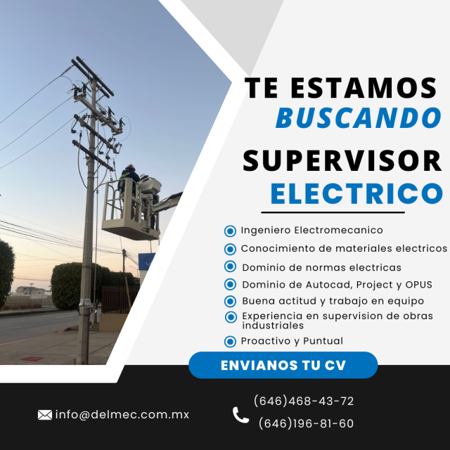 RequisitosIngeniero electromecánico Conocimiento de materiales eléctricos Dominio de normas eléctricas Dominio de Autocad, Project y OPUS Buena actitud y trabajo en equipo Experiencia en supervisión de obras industriales Proactivo y Puntual Disponibilidad para viajar
