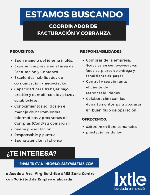 Favor de enviar cv al correo Info@bolsasymaletas.com o compras@bolsasymaletas.com