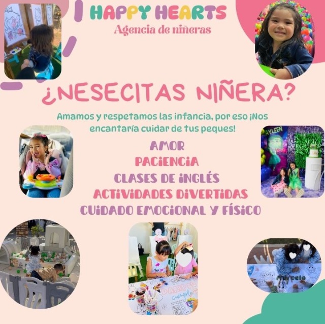 Somos una agencia de niñeras a domicilio, contamos con diversas tarifas dependiendo de varios factores, con diferentes servicios, como servicio eventual, fijo, acompañamos a eventos y también a viajes, contamos también con cursos de inglés, más información al 6462753279 o en nuestro perfil de Instagram tenemos referencias estamos como Happy Hearts