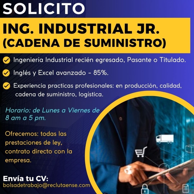 RequisitosSOLICITO INGENIERO INDUSTRIAL JUNIOR, INGLES Y EXCEL AVANZADO: *Ingeniería Industrial (Únicamente la carrera mencionada), recién egresado, Pasante o Titulado, ("NO ESTUDIANTES). *Indistinto de 24 a 40 años. *Experiencia mínima de 1 año en planificación de operaciones, cadena de suministro, inventarios, almacén, oferta y demanda, ventas, compras y/o que haya realizado su servicio social o practicas profesionales en dichas áreas. *Inglés avanzado (verbal y escrito) 85% - 90%. *Ganas de aprender y superarse. *Conocimientos: Six sigma, SolidWorks, Lean Manufacturing, gestión de proyectos. *Excel avanzado.- *Gráficos y Tableros (Dashboards). *Tablas dinámicas (Pivot Tables). *Fórmulas avanzadas (VLOOKUP, SUMIFS, COUNTIFS, SUMPRODUCT, IFERROR, MATCH). *Formato condicional. *Reportes de gestión *Tableau, Power BI, Hyperion o Cognos. *Excelentes habilidades analíticas y de resolución de problemas. *Excelentes habilidades de comunicación verbal y escrita, habilidades de facilitador y presentador. *Experto en priorización y trabajo multitarea en un entorno de ritmo acelerado. *Ofrecemos: todas las prestaciones de ley, contrato directo con la empresa, opción de contrato de planta, sueldo competitivo, trabajo estable. Horario: de Lunes a Jueves de 8 am a 5 pm (Trabajo presencial en oficina y Viernes en home office). Si cubres con el perfil, favor de compartir tu curriculum actualizado con fotografía: bolsadetrabajo@reclutaense.com