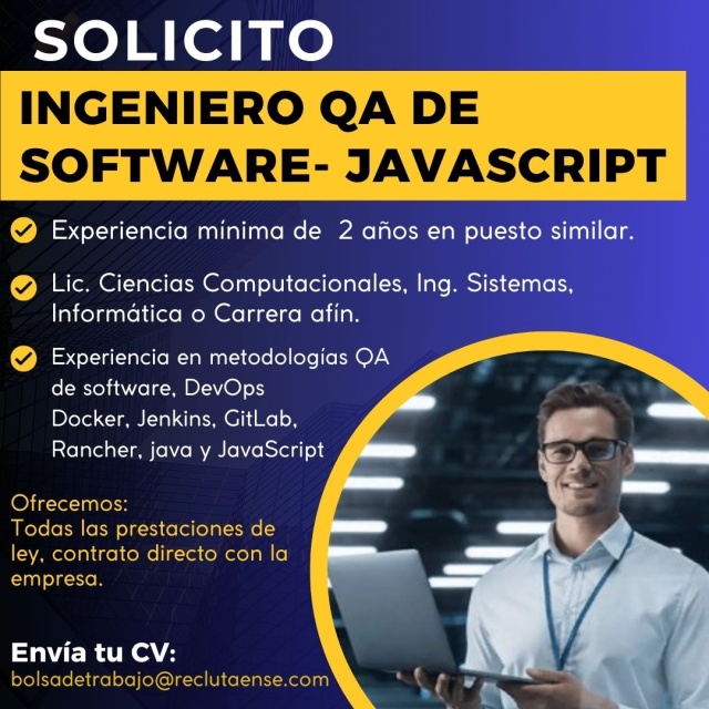 RequisitosSOLICITO INGENIERO QA DE SOFTWARE- JAVASCRIPT: *Ingeniería en Computación, Lic. en Ciencias computacionales, Lic. Informática y/o Carrera afín, Pasante o Titulado ("NO ESTUDIANTES). *Indistinto de 24 a 40 años. *Experiencia mínima de 2 años como Ingeniero QA de software. *Inglés intermedio (Verbal y escrito). *Conocimientos en Java y JavaScript *Experiencia profesional en el desarrollo y aplicación de pruebas. *Experiencia en la planificación y coordinación de las actividades de prueba. ? Experiencia en metodologías, herramientas y procesos del QA de software. *Experiencia en documentar los errores. *Experiencia básica administrando bases de datos relacionales y no-relacionales, así como de secuenciación de comandos *Excelentes habilidades analíticas y de resolución de problemas. *Conocimiento de lenguajes de programación altamente deseable. *Experiencia en frameworks de pruebas para JavaScript Deseable *Experiencia como DevOps trabajando con herramientas como: Docker, Jenkins, GitLab, Rancher. *Experiencia en pruebas de seguridad y de rendimiento. *Experiencia trabajando con metodologías agiles (Ágil, Scrum, etc.) Si cubres con el perfil, favor de compartir tu curriculum actualizado, con fotografía: bolsadetrabajo@reclutaense.com