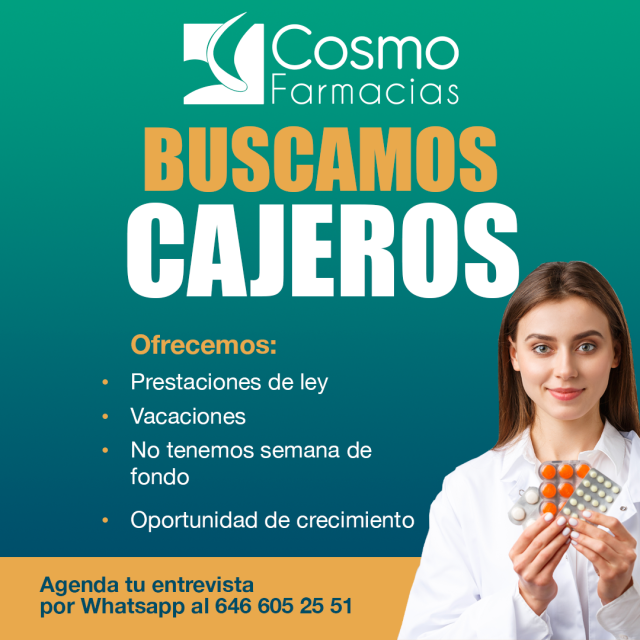 RequisitosBUSCAMOS CAJEROS PARA NUESTRAS SUCURSALES, CHAPULTEPEC, RAMIREZ MENDEZ, NOVENA Y MOCTEZUMA estamos contratando para el área de CAJAS. REQUISITOS CAJAS: Buscamos personal con -Preparatoria terminada -Experiencia en farmacias -Atención al cliente -Tiempo completo -OPORTUNIDAD DE CRECIMIENTO INTERESADOS Y GENTE QUE CUENTA CON LOS REQUISITOS FAVOR DE MANDAR WHATSAPP PARA AGENDAR ENTREVISTA CON BRENDA DOMINGUES (RECURSOS HUMANOS) 646 605 25 51
