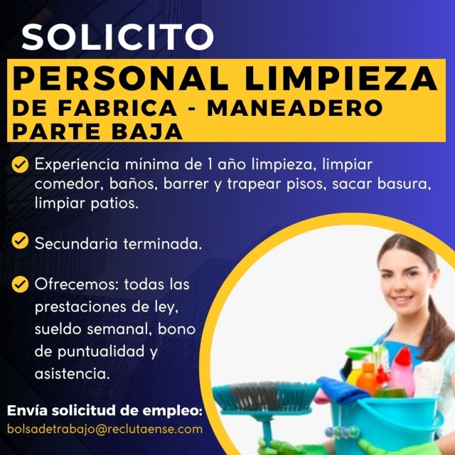 RequisitosSolicito personal de limpieza, para empresa en maneadero parte baja: *Mujer de 30 a 50 años, *Secundaria terminada, *Experiencia mínima de 1 año en limpieza de empresas u oficinas, *Actividades: limpieza de comedor, baños, patios, *Trabajadora, *Movida, *Honesta, *discreta. * Ofrecemos: todas las prestaciones de ley, contrato directo con la empresa, sueldo semanal. Si cubres con el perfil, envía foto de tu solicitud de empleo, llena por ambos lados: bolsadetrabajo@reclutaense.com