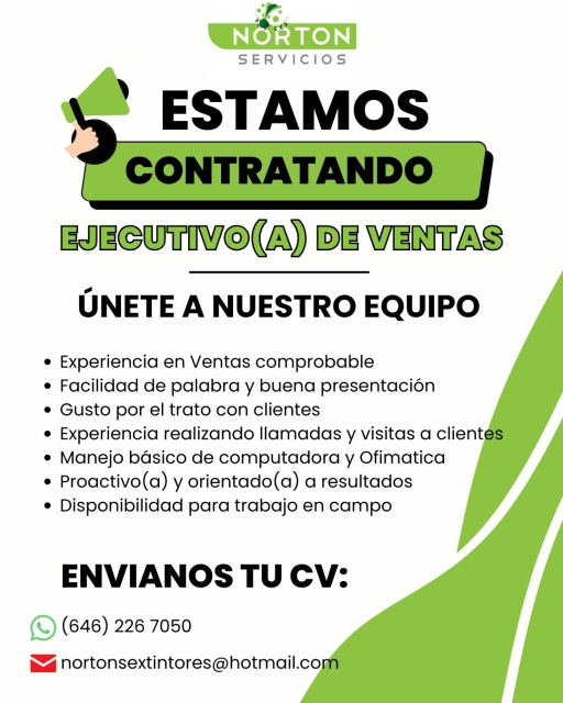 Envianos tu CV al correo: nortonextintores@hotmail.com o al WhatsApp: 646 226 7050
