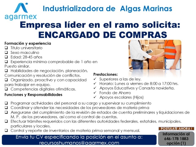 RequisitosFormación y experiencia Titulo universitario Sexo masculino Edad: 28-45 años Experiencia mínima comprobable de 1 año en Puesto similar. Habilidades de negociación, planeación, Comunicación y resolución de conflictos. Organizado, proactivo y con capacidad para trabajar en equipo. Competencias digitales ofimáticas. Funciones y Responsabilidades Programar actividades del personal a su cargo y supervisar su cumplimiento Coordinar y atender las necesidades de los proveedores de materia prima Asegurarse del cumplimiento de la revisión de estados de cuenta preliminares y liquidaciones de M. P. de los proveedores, así como el control de cuentas. Efectuar trámites requeridos con las diferentes autoridades federales, estatales, municipales, particulares y locales. Control y reporte de inventarios de materia prima semanal y mensual.