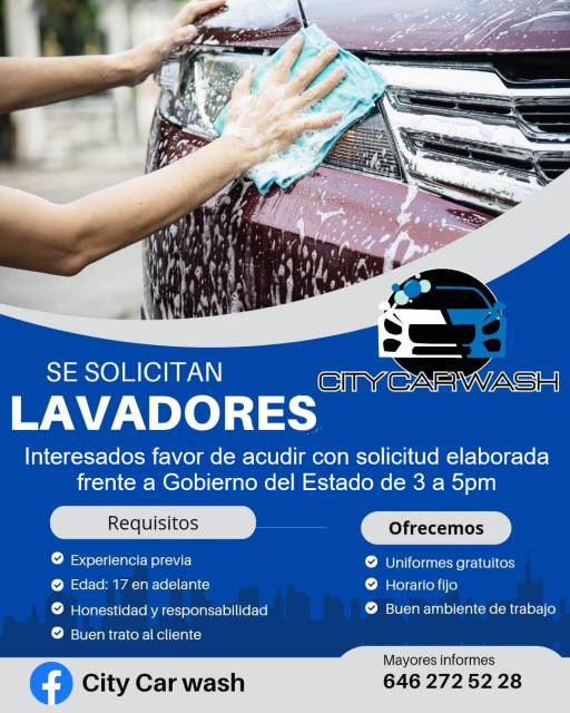 Interesados favor de acudir con solicitud de empleo elaborada a city car wash frente a gobierno del estado a un costado de los seguros qualitas