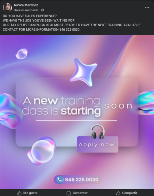 RequisitosNow Hiring: Join the Tax Relief Team in Ensenada! Tax Relief & Consolidation Campaign | On-Site Call Center Role A growing company specializing in Tax Relief and Debt Consolidation is currently hiring motivated professionals to join its on-site team in Playas de Chapultepec, Ensenada. Help U.S.-based clients manage and resolve their tax-related financial burdens while building a rewarding, high-paying career. What’s Offered: Paid Training: 5 days of onboarding with free lunch included Weekly Pay Up to: $350 dollars weekly + commissions Schedule: Monday–Friday: 8:00 AM – 5:00 PM Saturday: 12:00 PM – 4:00 PM Location: Playas de Chapultepec, Ensenada, B.C. (This is an in-office position) Candidate Requirements: Experience: Sales, Collections, Debt Relief, or Mortgage ( Call Center Experience Preferred) Skills: Fluent in English (spoken & written) Excellent communication and interpersonal skills Basic to intermediate computer literacy Strong presentation and reliability A typing test will be conducted during the interview process Next Steps: All applicants must complete a face-to-face interview.