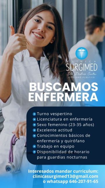 enviar CV al correo: clinicasurgimed13@gmail.com o WhatsApp (646)207-91-65