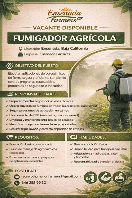 RequisitosDisponibilidad de horario Vivir en el área de Maneadero Experiencia en campo Agrícola Buena Condición Física