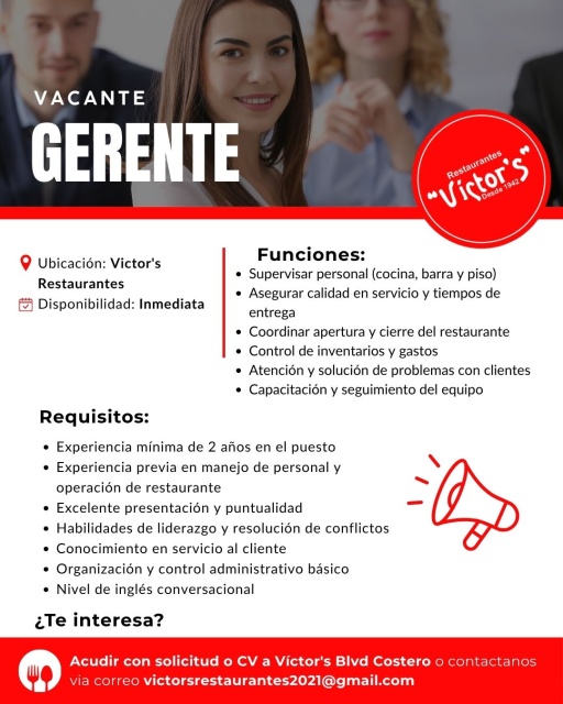 Acudir con solicitud o CV a Víctor's Blvd Costero o contáctanos vía correo victorsrestaurantes2021@gmail.com