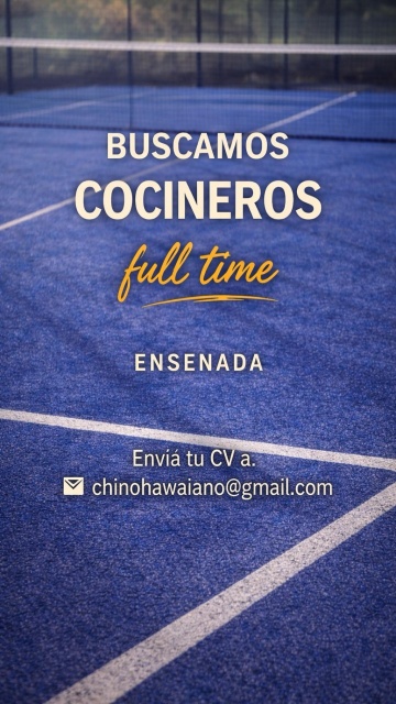 RequisitosCocina dentro de un club de pádel!! Experiencia en linea fría y caliente. Preparación de alimentos según recetas y estándares. Manejo higiénico de alimentos y limpieza de área de trabajo. Control básico de insumos y almacenamiento adecuado. Elaboración de inventarios y pedidos. DISPONIBILIDAD DE HORARIO ENVIAR CV a chinohawaiano@gmail.com