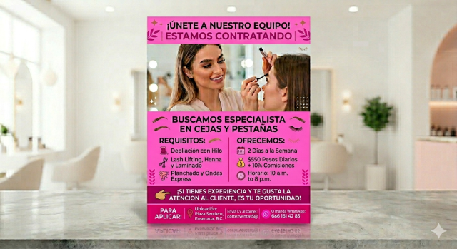 RequisitosFORMA PARTE DE NUESTRO EQUIPO Requisitos: • Experiencia en depilación con hilo • Laminado de ceja • Henna • Lash lifting • Planchado • Ondas express OFRECEMOS: • 2 días a la semana • Sueldo de $550 por día • 10% de comisiones SI TIENES EXPERIENCIA Y TE GUSTA LA ATENCIÓN AL CLIENTE ES TU OPORTUNIDAD. Horario: De 10:00 a.m. a 8:00 p.m. Contacto: Envía tu CV al correo: cortezventas5@gmail.com O manda WhatsApp: 646 161 42 85
