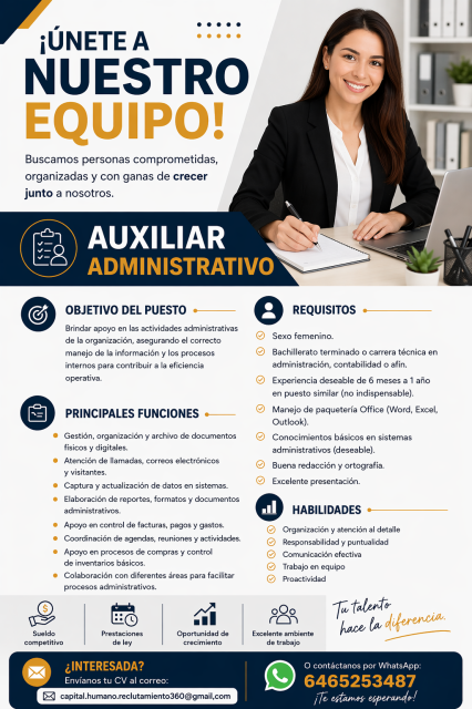 RequisitosREQUISITOS Sexo femenino. Bachillerato terminado o carrera técnica en administración, contabilidad o afín. Experiencia deseable de 6 meses a 1 año en puesto similar (no indispensable). Manejo de paquetería Office (Word, Excel, Outlook). Conocimientos básicos en sistemas administrativos (deseable). Buena redacción y ortografía. Excelente presentación. ¿INTERESADA? Envíanos tu CV al correo: ???? capital.humano.reclutamiento360@gmail.com O contáctanos por WhatsApp: ???? 6465253487 ¡Te estamos esperando!