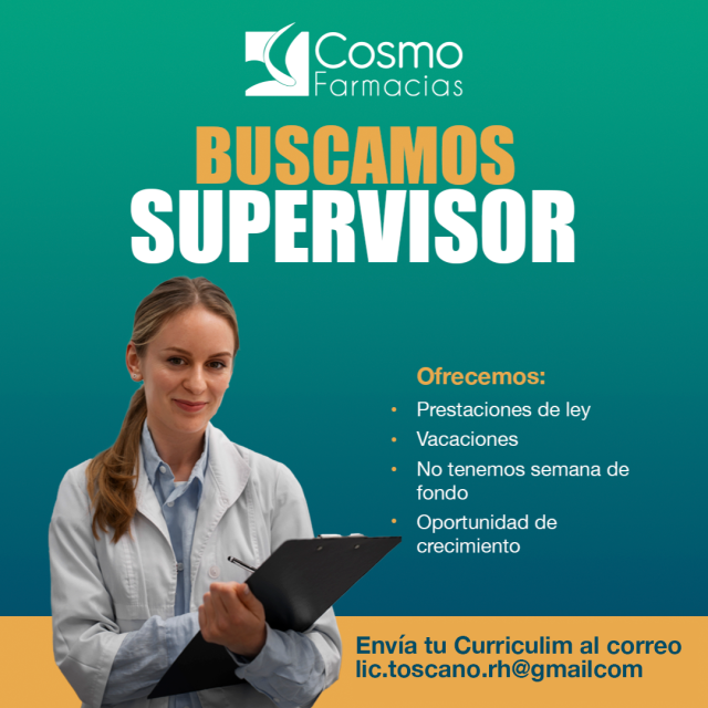 RequisitosSE SOLICITA SUPERVISOR DE SUCURSAL CON CONOCIMIENTO EN FARMACIAS Y MANEJO DE PERSONAL. -MAYOR DE EDAD (21-45 AÑOS) -MANEJO DE PERSONAL -EXPERIENCIA MINIMA 1 AÑO COMO SUPERVISOR. -MANEJO DE COMPUTO. -EXCELENTE PRESENTACIÓN Y TRATO AL CLIENTE. INTERESADOS MANDAR CURRICULUM AL CORREO: lic.toscano.rh@gmail.com O TRAER SOLICITUD ELABORADA A LA SUCURSAL COSMO FARMACIAS NOVENA Y MOCTEZUMA
