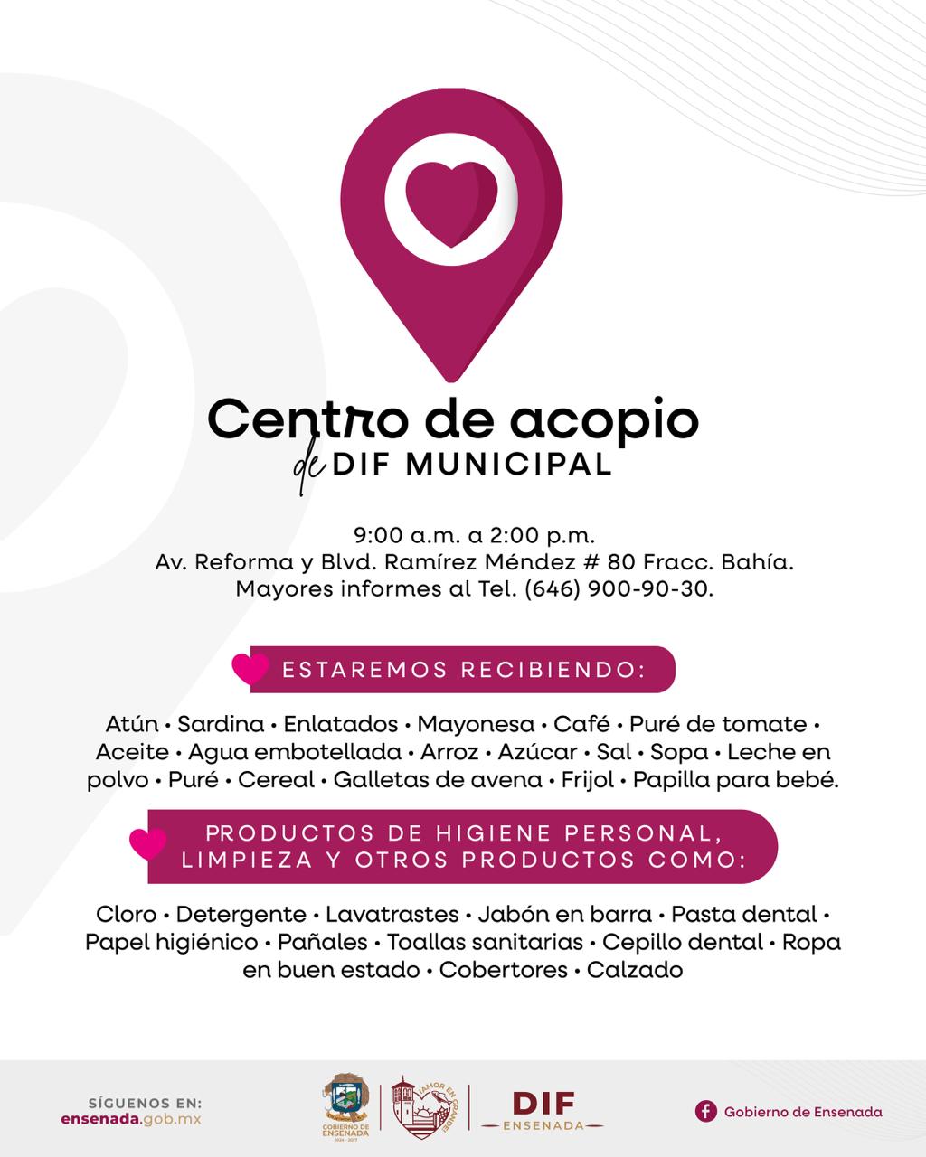 La alcaldesa resaltó que, a partir de este miércoles 15 de octubre, se abrirá un Centro de Acopio en las instalaciones de DIF Municipal, ubicadas en la calle Reforma y bulevar Adolfo Ramírez Méndez No. 80 del fraccionamiento Bahía, que brindará servicio en horario de 8:00 a 14:00 horas.