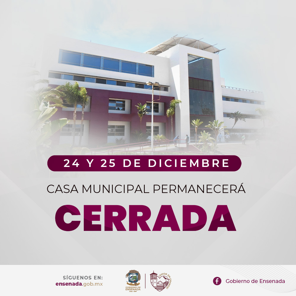 Ensenada, B.C.- Lunes 22 de diciembre de 2025.- Con motivo de la celebración de Nochebuena y Navidad, el Gobierno de Ensenada que preside Claudia Agatón Muñiz informa a la población que los días 24 y 25 de diciembre permanecerán cerradas las oficinas de la Casa Municipal.