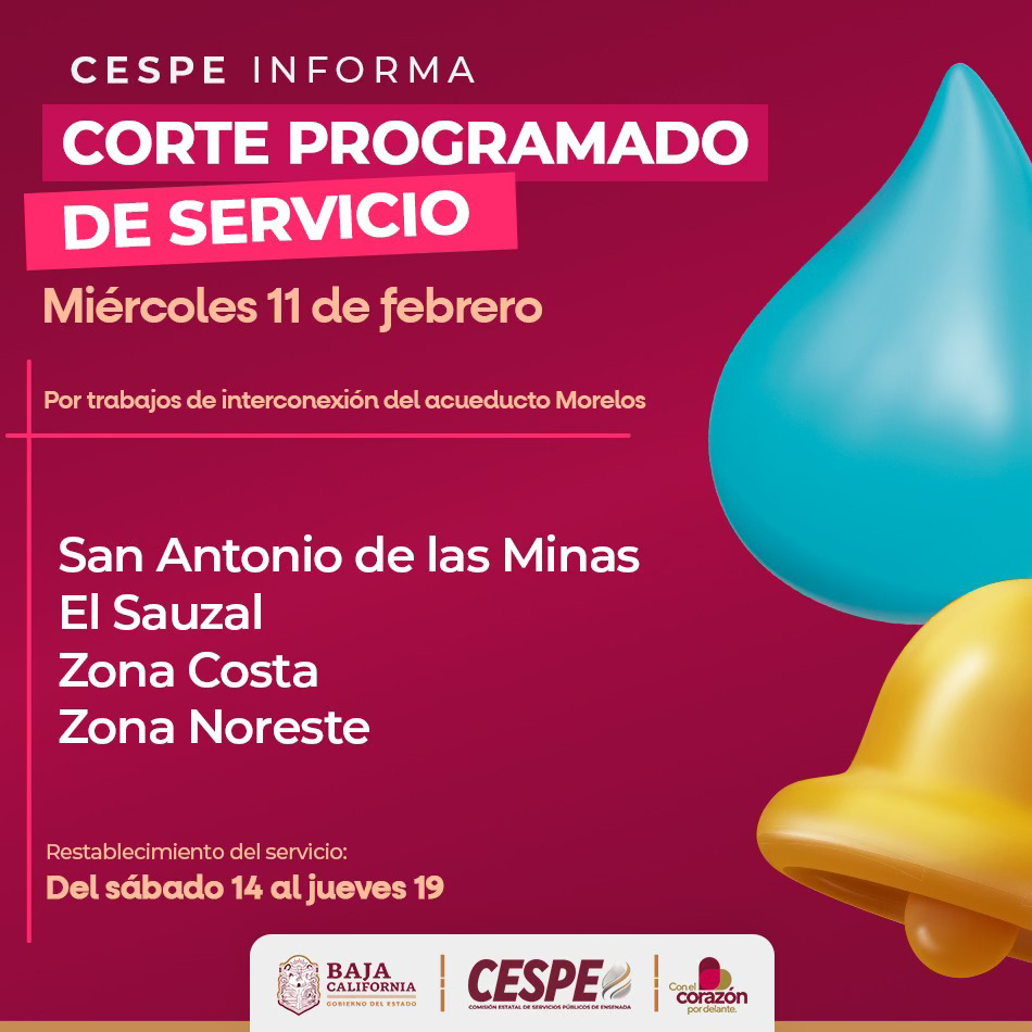 ENSENADA.- Derivado de la obra de reposición del acueducto Morelos, la Comisión Estatal de Servicios Públicos de Ensenada (CESPE) informa que se ha programado una suspensión temporal en la operación del sistema hídrico a fin de realizar trabajos de interconexión de la infraestructura hídrica.