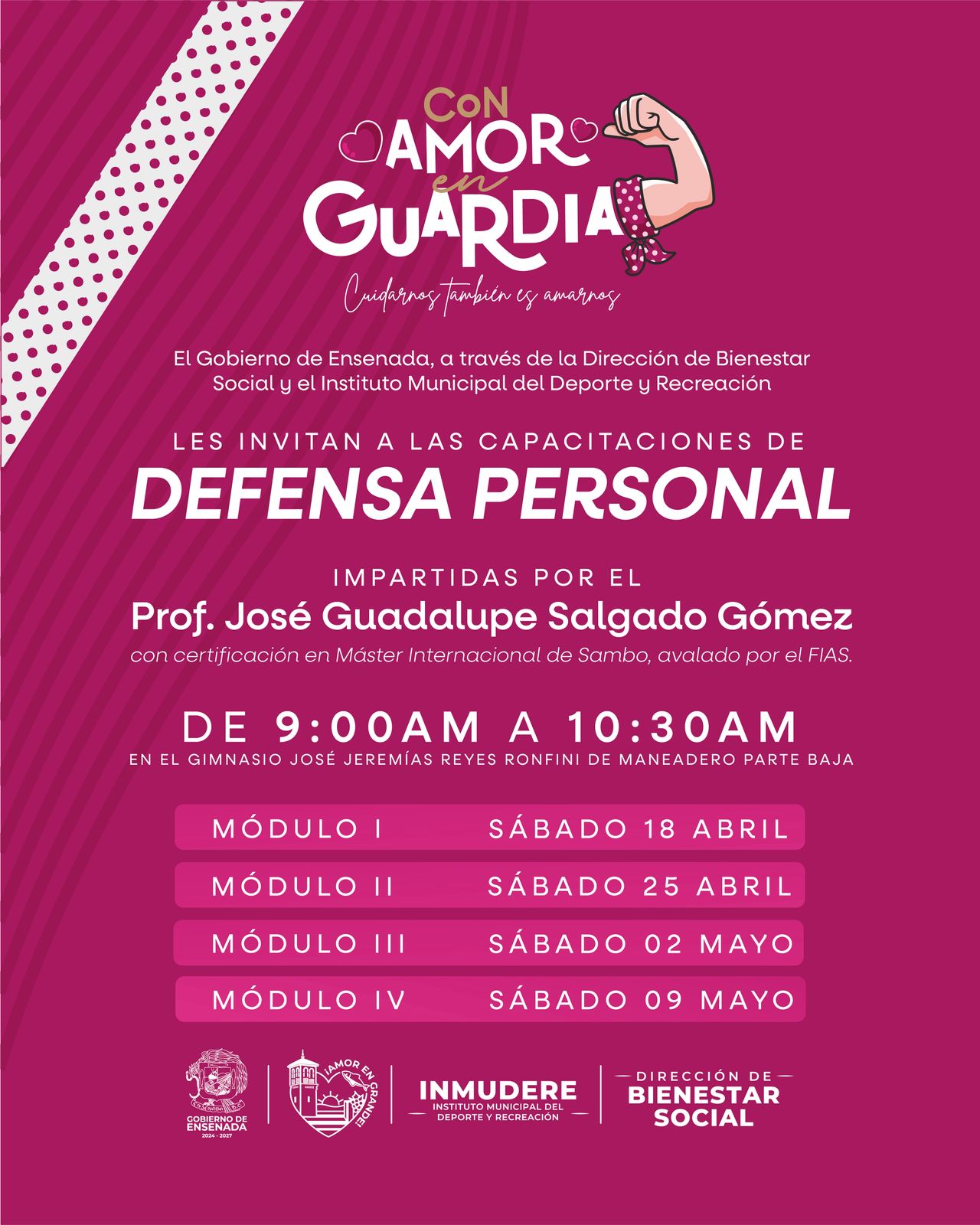 Las capacitaciones serán impartidas por José Guadalupe Salgado Gómez, Máster Internacional de Sambo, quien compartirá técnicas básicas de defensa personal, control y reacción en situaciones de riesgo.